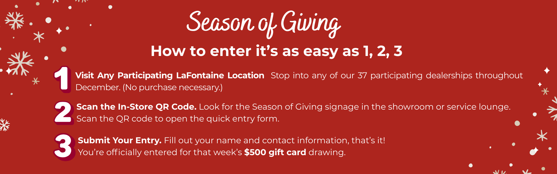 During the Promotion Period, anyone 18 years of age or older may visit the following LaFontaine locations during regular business hours to submit an entry form: